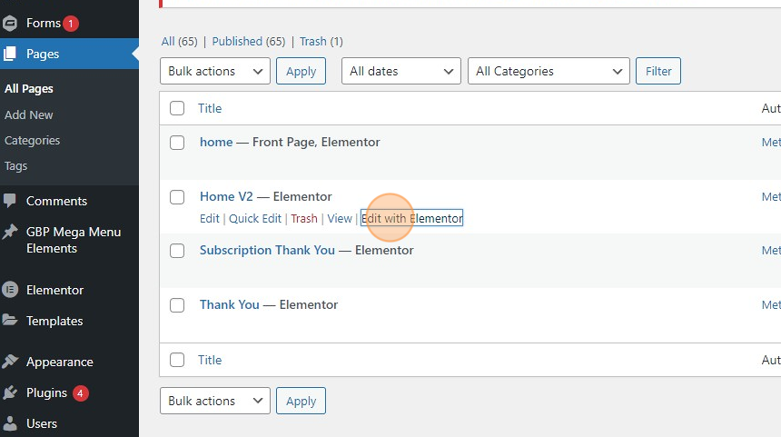 6. Navigate back to your new page or reopen it by going to Pages and click ‘Edit with Elementor’ of the “New” page